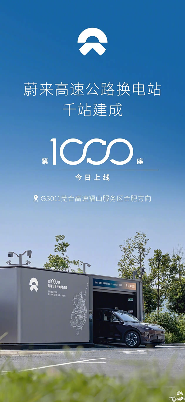 7月9日,蔚来汽车官方刚刚宣布,历时2429天,蔚来第1000座高速公路换电站于G5011芜合高速福山服务区正式上线。