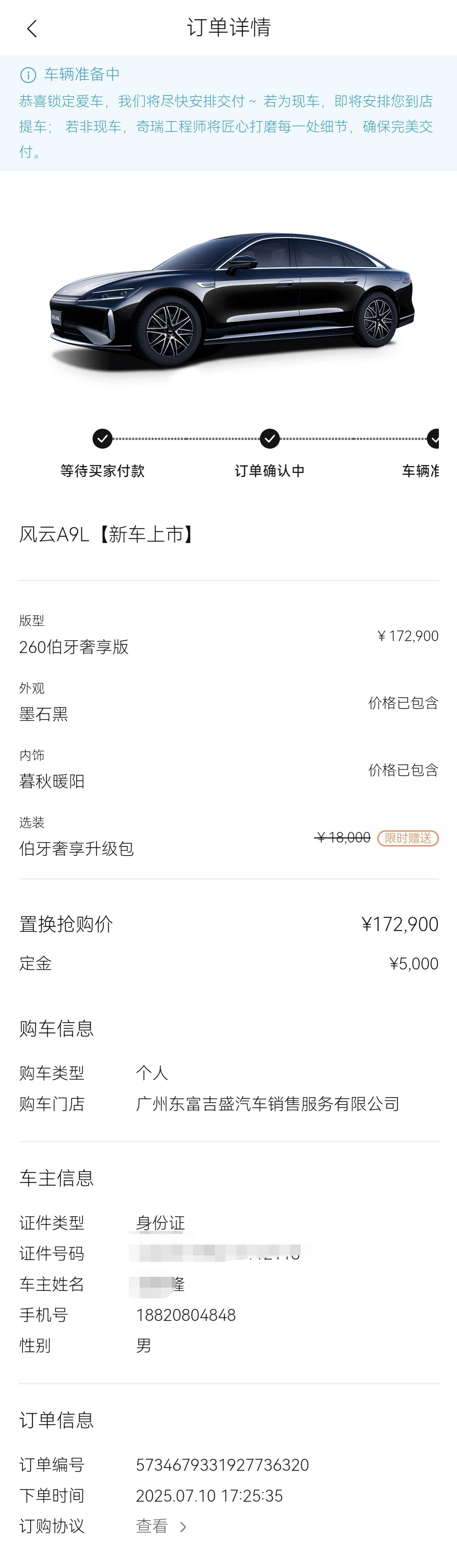 试驾完直接定车了,在奇瑞APP操作,选择店面提车即可,交5000定金,定了黑外+米内这款。