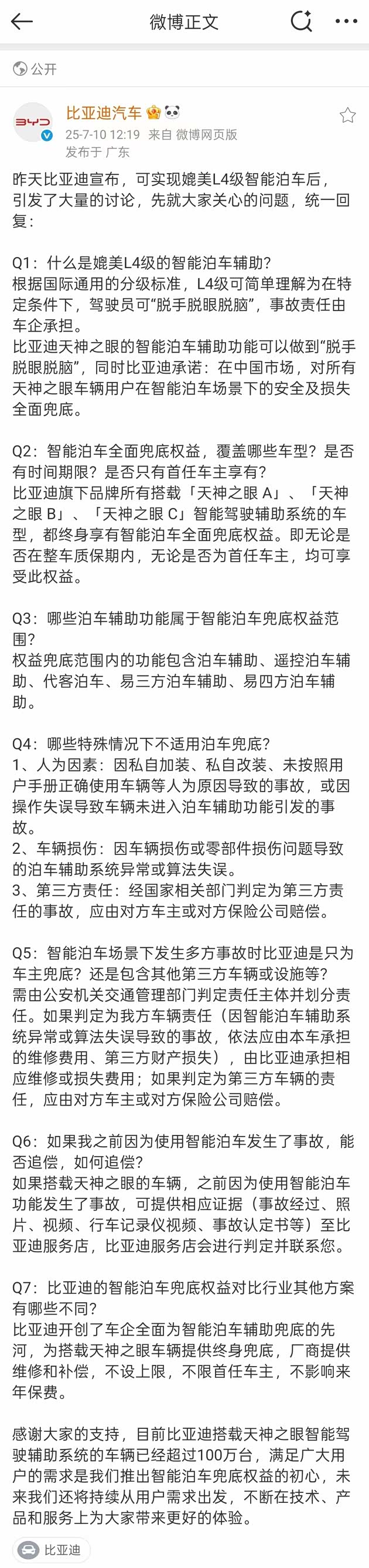 比亚迪全球率先提出为智能泊车兜底,底气来源于其拥有中国最大的智能辅助驾驶车云数据库、全球最大的智驾研发工程师团队、全球最大规模的新能源生产制造体系。同时,天神之眼智驾车型保有量已经超过100万,真正让智能驾驶走入千家万户,开创全民智驾时代,用实际行动践行了“好技术,就应该人人可享”的理念。比亚迪将继续携手行业伙伴,为越来越多消费者带来更安全、更智能的用车体验。