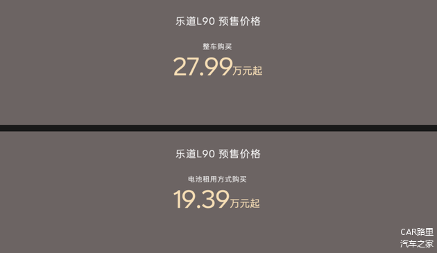 首先从价格来看,目前乐道L90已经开启预售,预售价为27.99万元起,如果采用电池租用方案的话,预售价19.39万元起。好家伙,一款车长超过5米1,轴距超过3米1的大型SUV,如今价格已经不到20万了,而且这还只是预售,预计正式上市之后价格还要更低。虽然这个价格不包含电池,单就超2吨的大块头来说,乐道完全是把L90“论斤卖”。