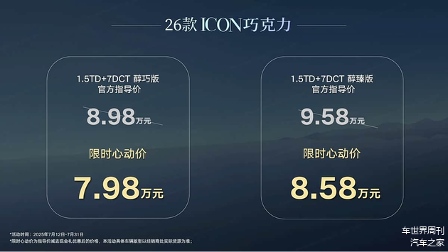 新款吉利ICON巧克力在车型配置方面进行精简,仅提供2款车型,分别为1.5TD醇巧版和1.5TD醇臻版,两款车型在动力方面保持一致,只是在智能驾驶和舒适性配置方面有所区别。