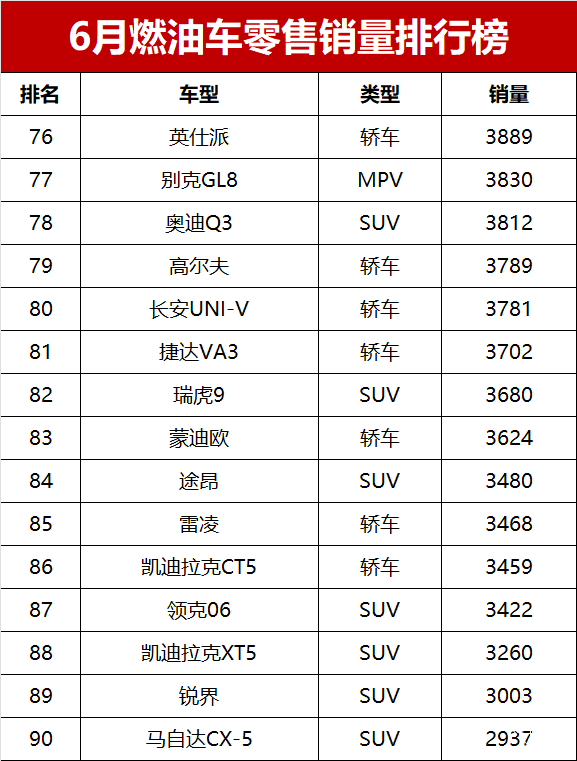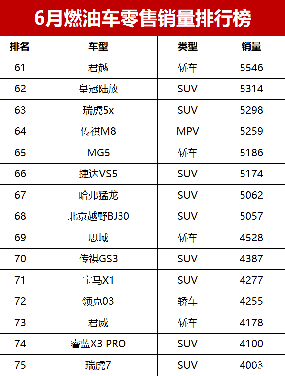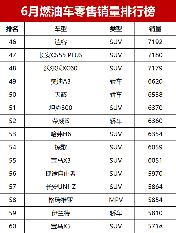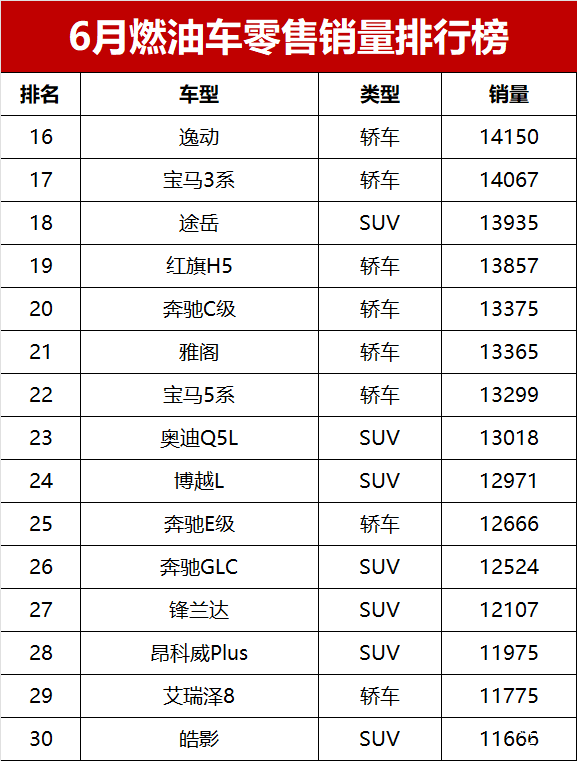 【2025年6月燃油车零售销量排行榜】在车市竞争日益激烈的当下,6月国内燃油车市场在整体车市大环境中展现出独特态势。乘联分会数据显示,6月全国乘用车市场零售208.4万辆,同比增长18.1%,而近年来销量持续下滑的燃油车本月销量却保持增长,达到90.8万辆,同比增长7.2%,各车型销量排名也呈现出多样变化。