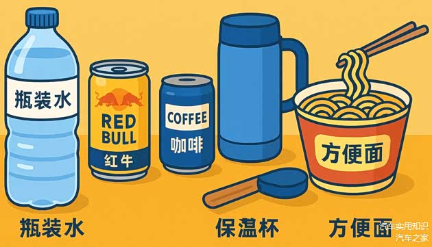 🥤 饮品:瓶装水、红牛、咖啡、保温杯🍜 即食类:方便面、自热饭、压缩饼干、牛肉干、巧克力🥣 餐具类:折叠碗、便携筷子、野餐垫🍇 零食推荐:坚果、果干、能量棒、薯片