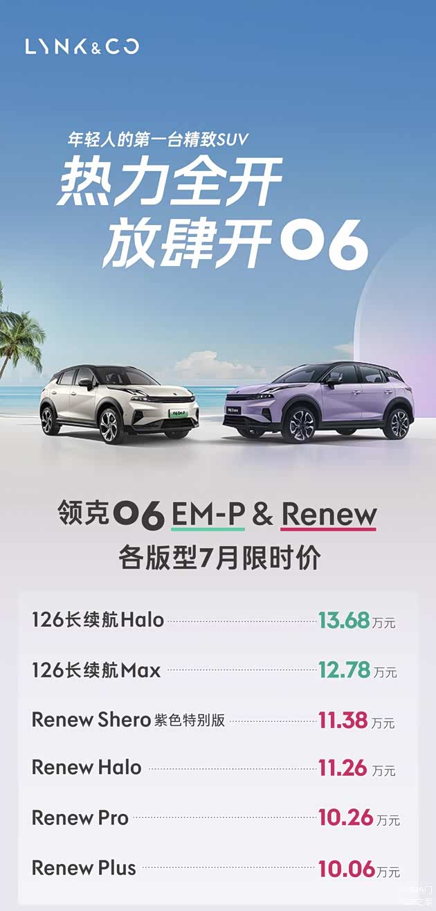 7月的购车政策更是领克06的一大亮点。领克06EM-P可享受10000元限时购车补贴、至高10000元超享换新补贴、至高2000元置换或增购补贴以及至高20000元国家报废补贴,限时专享价12.78万起。领克06 Renew可享受6000元限时补贴、至高2000元置换或增购补贴、至高10000元超享换新补贴、至高15000元国家报废补贴,还支持5年贷10万3年0息,限时专享价10.06万起,对预算有限或刚工作的年轻朋友十分友好。