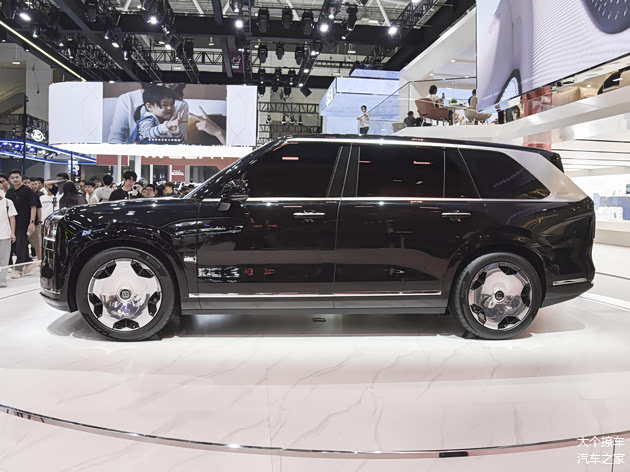当你走到车身的侧边,你会看到平直的车顶设计与熏黑的A柱相结合,形成了一种悬浮的车顶效果,使得整车的线条显得既专业又流畅。粗壮的D柱进一步加强了车身的力量感,而贯穿式的腰线设计使得车身在视觉上显得更为修长和气派。在轮眉位置,粗大的黑色装饰板与大饼状的轮毂相结合,进一步增强了整车的霸气。