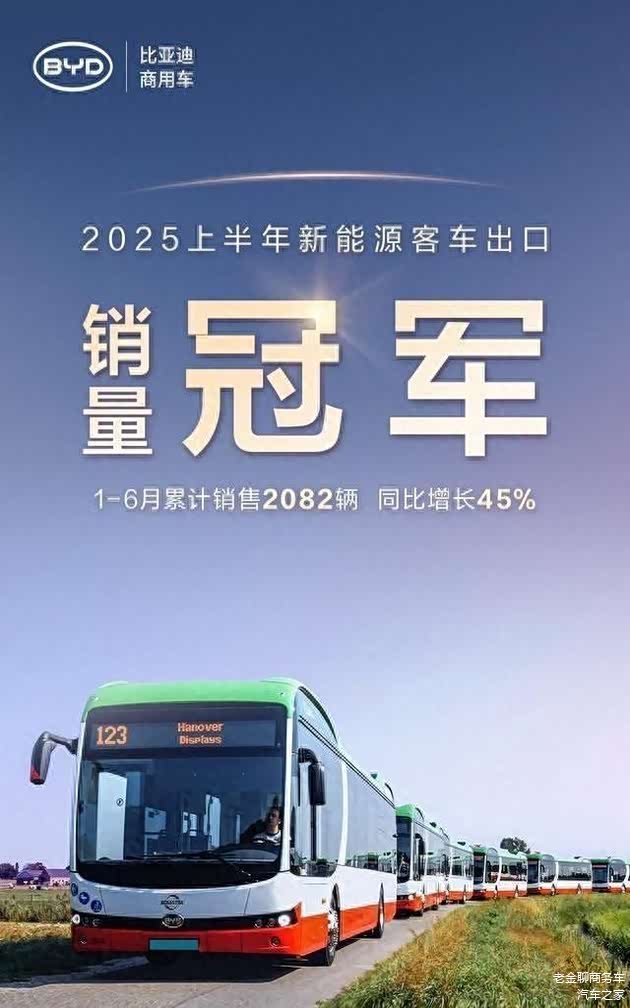 中国新能源车企又传来好消息!近日,比亚迪官方公布2025年上半年新能源客车出口数据,1-6月累计销量达2082辆,同比增长45%,以27.29%的市场份额稳居全球新能源客车出口第一。这一成绩不仅延续了比亚迪在海外市场的强势表现,更让中国制造再次成为全球绿色交通的焦点。