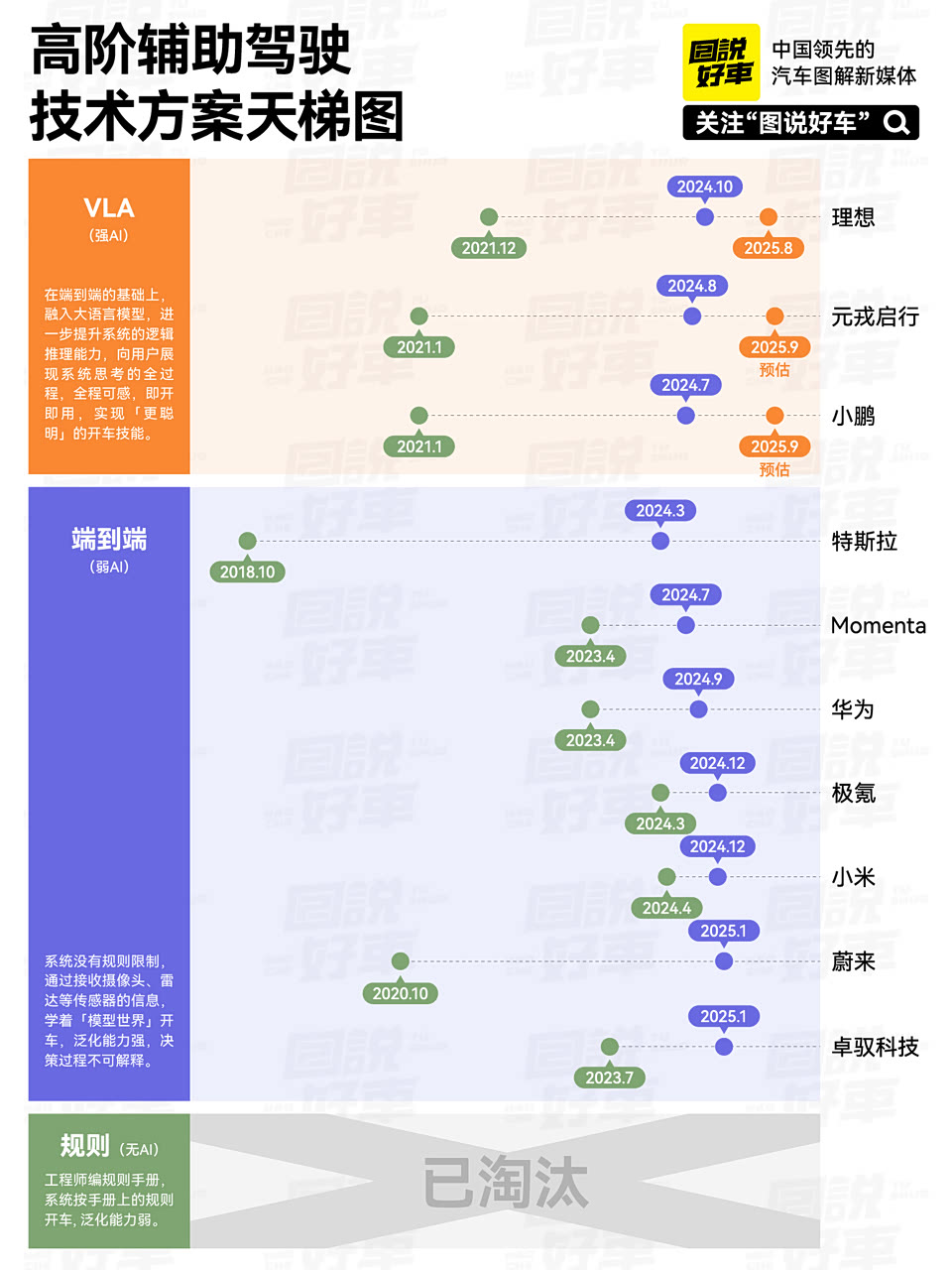 VLA 可以说是目前行业的辅助驾驶最先进的阶段了,至于规则阶段,则主要是用在一些基础辅助驾驶能力的车型上,一般仅提供高速领航辅助的车用的都是规则。