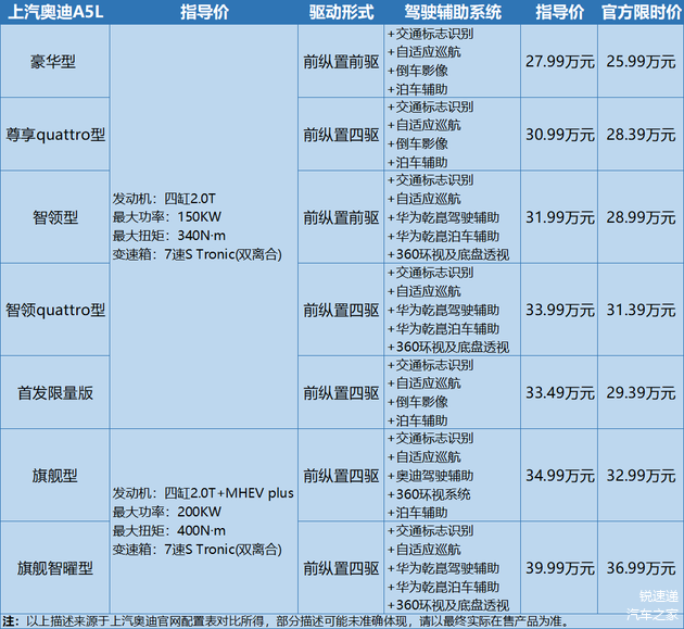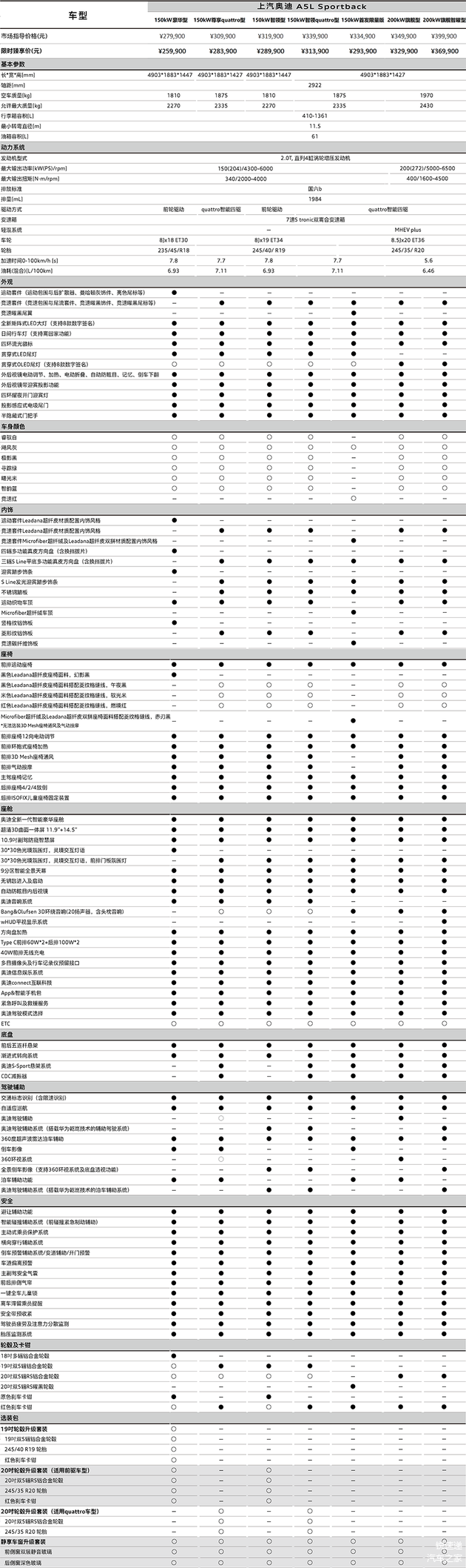 本次上市的上汽奥迪A5L Sportback采用150KW前驱和四驱,200KW四驱,三种动力形式,均配备直列四缸2.0T发动机,其中200KW版本配备了轻混系统,配置方面值得注意的是除了传统配置的升级,新A5L Sportback采用多种驾驶辅助方案,其中豪华型、尊享quattro型、首发限量版仅配备自适应巡航,旗舰型则搭配了奥迪自研的驾驶辅助,智领型、智领quattro型、旗舰智曜型3款配备了具有华为乾崑技术的驾驶辅助和泊车辅助系统(详见本文官方配置表附图)。