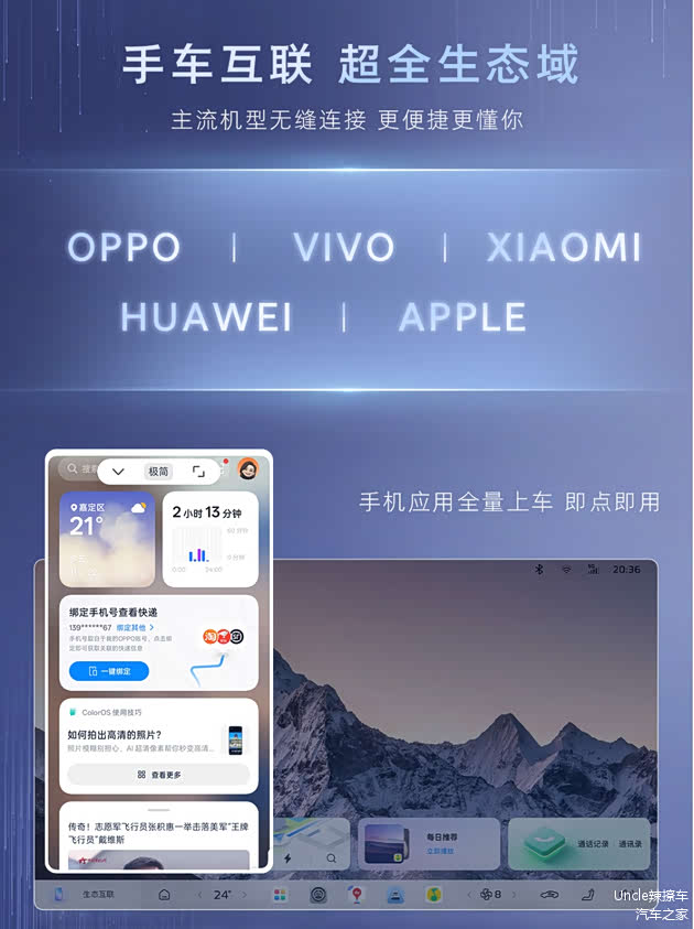 主流手机全量上车,支持无线CarPlay与华为HiCar,音乐、视频、地图无缝流转。