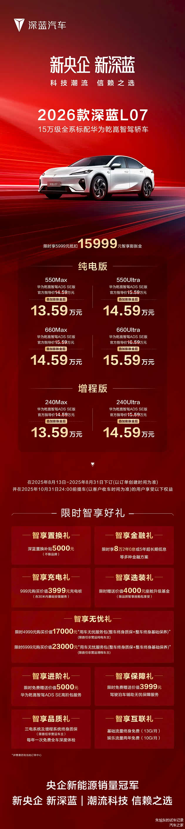 8月13日,15万级唯一全系标配华为乾崑智驾轿车——2026款 深蓝L07焕新上市,共推出6个版本,售价区间为13.59-15.59万元。新车不仅全系标配华为乾崑智驾ADS SE,还采用进化升级的深蓝超级增程2.0,并凭借科技美学、新智舱、新驾乘等全维越级实力,成为新能源轿车市场的新焦点。