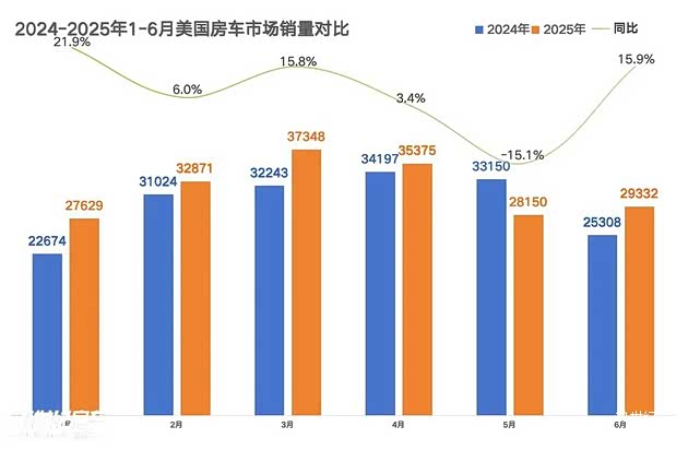 2025年上半年,美国房车市场在经历前期波动后呈现稳步回稳态势,复苏势头显著。根据美国房车工业协会(RVIA)数据,上半年累计销量达190,705辆,较2024年同期的178,596辆同比增长6.8%。其中,6月单月销量为29,332辆,同比大幅增长15.9%,市场活力显著提升。