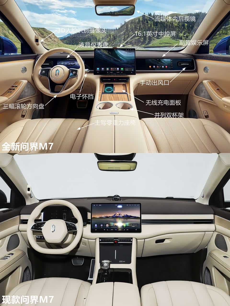 从官图来看,全新问界M7采用全新布局,方向盘升级为问界M8同款三幅式滚轮方向盘,交互界面升级为液晶仪表盘+16.1英寸中控屏+副驾娱乐屏三屏,同时提供AR-HUD抬头显示系统。