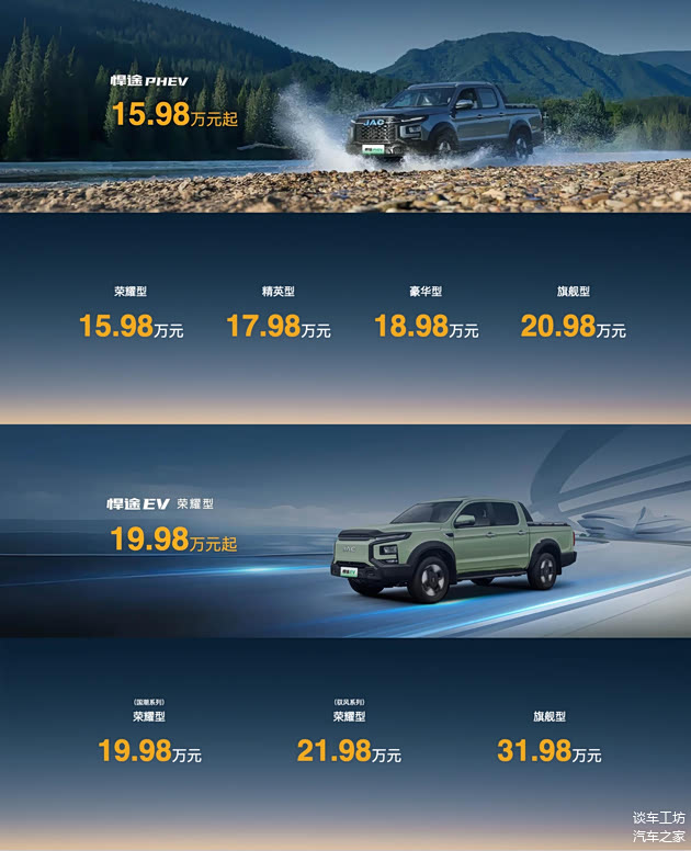 千钧之势,敢纵山河!全球首款千扭电混皮卡——悍途PHEV基于江汽集团自主研发的“H-Power”悍行超级电混架构打造,拥有“超级电混、五星安全、全域场景”等核心价值,市场指导价为15.98万元-20.98万元,上市期间购车可享订车礼,限时下订1000元抵3000元;焕新礼,增换购补贴至高10000元;质保礼,电池电机5年/20万公里、电控8年/20万公里;畅联礼,基础流量终身免费,娱乐流量3年免费(每月3GB)。同步上市的国内首款非承载式纯电四驱皮卡——悍途EV,市场指导价为19.98万元-31.98万元,上市期间购车可享订车礼,限时下订1000元抵3000元;质保礼,电池8年/40万公里、电机电控5年/20万公里;畅联礼,基础+娱乐流量终身免费(每月3GB)。