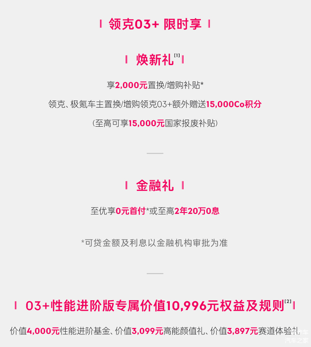 为回馈用户,领克03家族推出7月限时购车福利。领克03冠军版有6,000元购车补贴、10,000元超享焕新补贴及多种金融礼;领克03+和领克03++也有置换/增购补贴、国家报废补贴、金融礼等,部分车型还有额外积分赠送和交车礼、限时新人礼等。