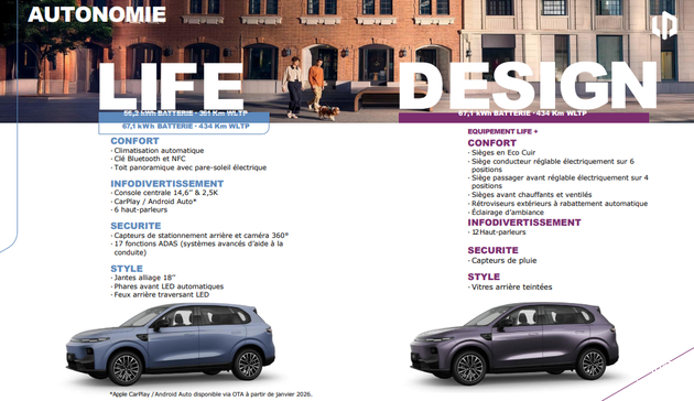 零跑B10在法国上市:共推出三款车型:Life Pro(56.2kWh电池 - WLTP:361km)、Life ProMax(67.1kWh电池 - WLTP:434km)和Design ProMax(67.1kWh电池 - WLTP:434km),售价分别为:2.84万欧元(约合人民币23万元)、3万欧元(约合人民币24.9万元)和3.1万欧元(约合人民币25.73万元)。全系标配218马力单电机后驱。