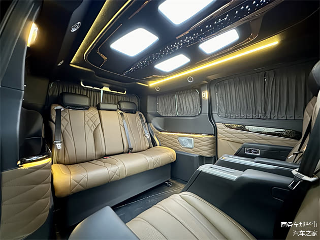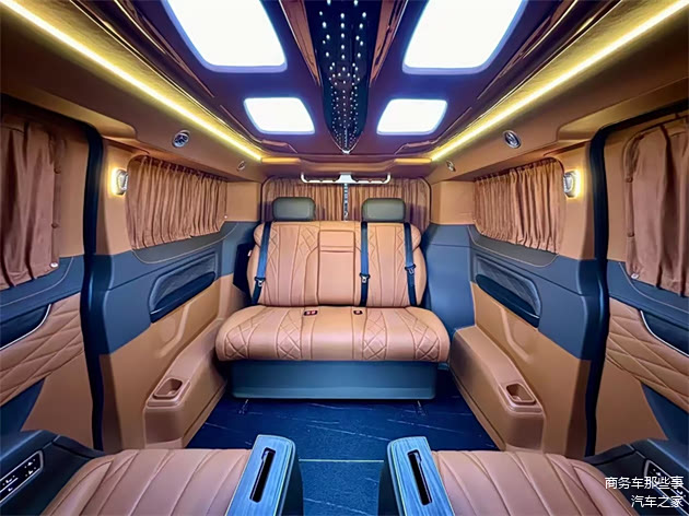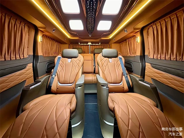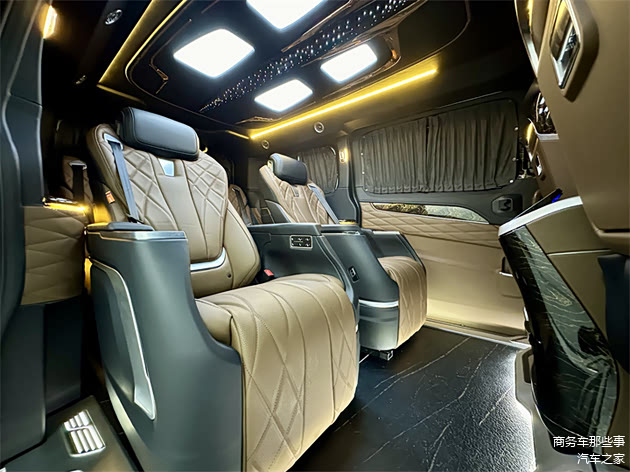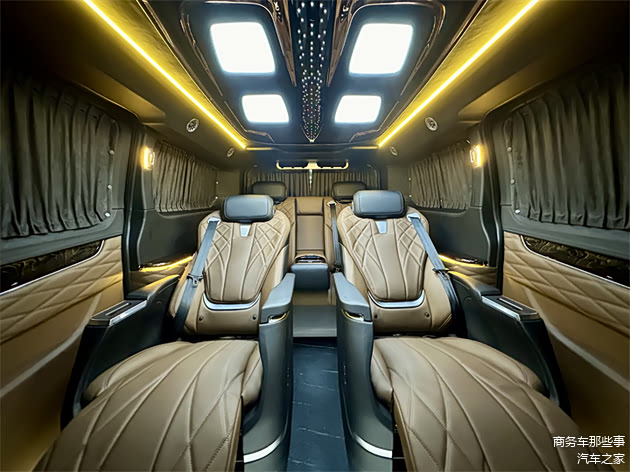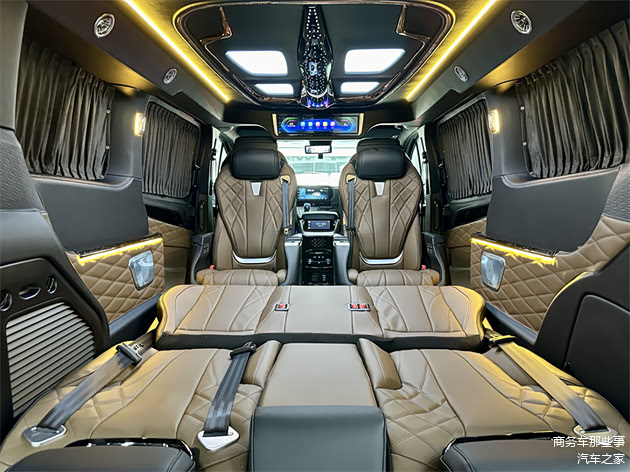 进入到车的内饰里面去,官方配色颜色还是比较多样化的,能够选择像亮丽一点的颜色,稳重一点的颜色,包括清新一点的颜色都可是可以能够给得到的。其中属暮光之城的颜色是最受欢迎的,非常的亮丽具有色彩,从驾驶室开始看,中央扶手冰箱,驾驶室座椅的电动调节,以及通风和加热的舒适功能,通通都有。整车全部都是豪华的软包,覆盖在方方面面,座椅墙板顶部都是的。商务舱带有无线网络电视机,搭载的是vvcar的环绕音响,视听感受都特别的到位,车里面也能够进行休闲娱乐模式,看电影听听音乐都能够满足。中排是豪华的航空大座椅,通风加热按摩旋转腿托的功能通通都有,全部都是多项的一个电子调节简单又便捷。第3排是联排的沙发床可以180度的进行放平平躺,这里面可以正常的进行休息睡觉,在行驶的过程中,沙发床也是可以180度的放平。