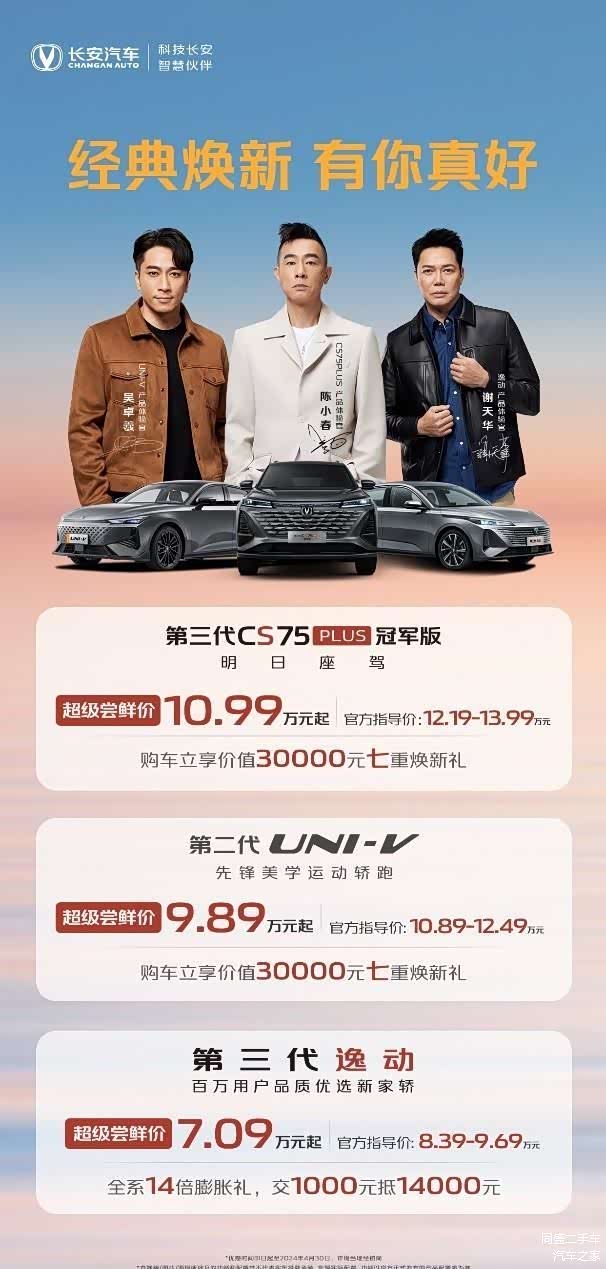 同时,为了助力更多消费者轻松焕新,长安汽车还为三车用户准备了多重大礼。即日起至4月30日,第三代CS75PLUS冠军版以及第二代UNI-V的用户,购车即可立享至高30000元七重焕新礼!第三代逸动用户购车,即可享交1000元抵14000元的全系14倍膨胀礼,以7.09万元起的超级尝鲜价,将“百万用户品质优选新家轿”开回家!