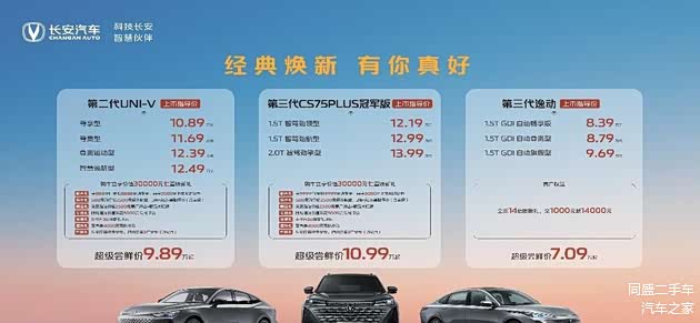 3月20日,以“经典焕新·有你真好”为主题的长安汽车春季焕新发布会盛大召开。发布会上,长安汽车第三代CS75PLUS冠军版、第二代UNI-V、第三代逸动三款新车正式上市。其中第三代CS75PLUS冠军版发布3款车型,售价12.19万元-13.99万元;第二代UNI-V发布4款车型,售价10.89万元-12.49万元; 第三代逸动发布3款车型,售价8.39万元-9.69万元。