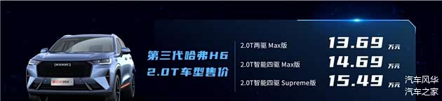 发布会上,黑科技星球首席营销官杨志明正式公布第三代哈弗H6 2.0T车型的售价,2.0T两驱Max版、2.0T智能四驱Max版、2.0T智能四驱Supereme版三大版本售价分别为13.69万元、14.69万元、15.49万元,以亲民定价让用户享受更智能、更酣畅的驾控体验。同时,车主代表还上台为广大车主争取到了最大福利,前10000名第三代哈弗H6 2.0T车主可享受6年12次免费基础保养的专属优惠政策。此外,第三代哈弗H6 2.0T车型还提供六大超神礼遇,包含36期0息或50%首款+尾款弹性贷的超值金融礼、至高6000元的超高置换礼、1000元车主精品大礼包的超足暖心礼,以及终身免费基础流量+3年娱乐和尊享服务的超额流量礼、免费FOTA升级的超前升级礼、首任车主发动机+变速器核心部件终身质保的超长质保礼,给消费者十足的诚意。