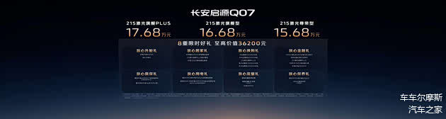 上新带来三款配置:215激光旗舰PLUS、215激光旗舰型、215激光尊荣型,价格范围从15.68万元到17.68万元。厂家诚意满满,购车即享8重大礼包,总值36200元,再叠加五大承诺,安心到位。上市以来,Q07热销不止,9月交付10192辆,总销售超6.8万,群众基础很扎实。