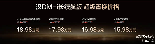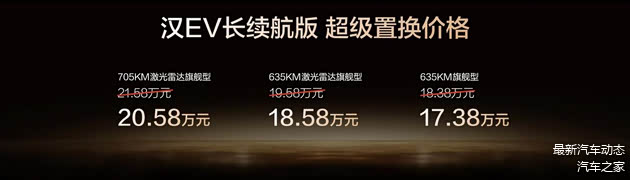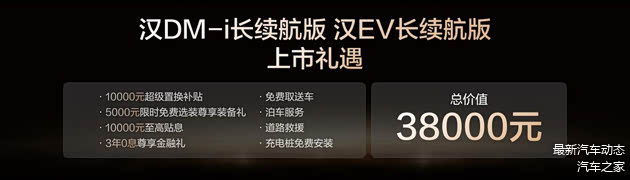 此次,汉DM-i长续航版共推出4款车型,补贴后售价15.98万~18.98万元;汉EV长续航版共推出3款车型,补贴后售价17.38万~20.58万元(10月31日前完成购车可享1万元超级置换补贴)。同时,比亚迪还为用户准备了包含置换补贴在内的至高价值3.8万元七大礼遇。