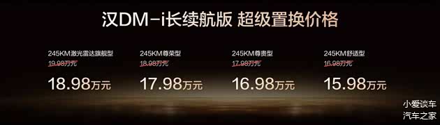 此次,汉DM-i长续航版共推出4款车型,补贴后售价15.98万~18.98万元;汉EV长续航版共推出3款车型,补贴后售价17.38万~20.58万元(10月31日前完成购车可享1万元超级置换补贴)。同时,比亚迪还为用户准备了包含置换补贴在内的至高价值3.8万元七大礼遇。