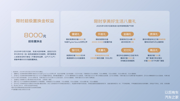 价格永远是消费者最敏感的神经。银河A7的限时指导价定在8.18万至11.78万元区间,这个价格本身就颇具竞争力。但更让人心动的是,在10月31日前下订的用户还能享受包括价值8800元的16扬声器Flyme Sound无界之声、2000-5000元配置升级、8万24期0息等八重权益,以及不限品牌的8000元超级置换金。这样的价格与权益组合,让银河A7在入门阶段就展现出强大的市场吸引力。