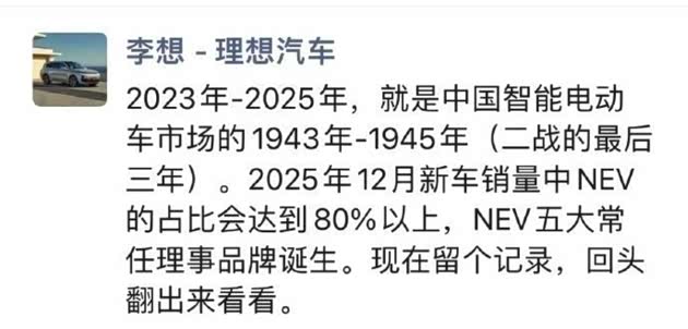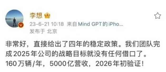2023 年 6 月 21 日,当时国家公布了新的新能源车购置税优惠政策,增程和纯电力度一样,李想当时表示 2025 年的目标是年销 160 万辆。