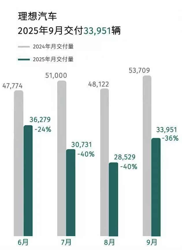 而 2025 年,随着增程 SUV 的玩家越来越多,理想 L 系列的销量开始顶不住了,6-9 月的销量分别同比下滑了 24%、40%、40%和 36%。
