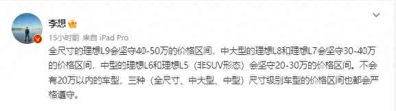 2023 年 1 月 30 日,李想表示理想 L6 和理想 L5(暂时还没出)会坚守 20-30 万的价格区间。不会有 20 万以内的车型。