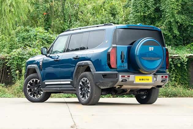 车尾部分,捷途纵横G700使用了左右独立布局尾灯组,并且还提供了侧开式后尾门(支持电吸)+外挂式备胎包。另外,造型硬朗的后包围与前包围设计风格相似(底部带有双侧外露式拖车钩和隐藏式排气)。