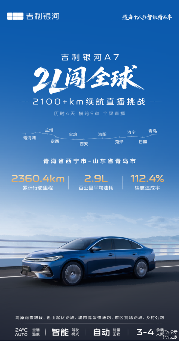 这场从青海西宁到山东青岛的挑战,途经高原雨雪、盘山公路、城市拥堵等复杂路况。其中,西安至洛阳的连续爬坡路段尤为严苛:山路起伏频繁,对动力持续性要求极高,且车辆处于馈电状态,电池电量有限。传统油混车型常因动力衰减导致加速变弱,但银河A7却表现稳定——全程开启智能能量回收系统,AI算法实时调整动力分配,即便在爬坡时,百公里加速仍稳定在7.1秒,与满电状态几乎无异。