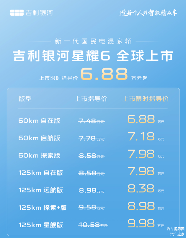 值得一提的是,吉利银河星耀6迎来正式上市,共推出7款车型,售价区间为7.48-10.58万元,上市限时指导价为6.88-9.98万元。