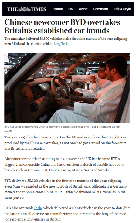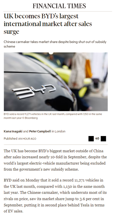 看到这个信息,还做啥旅游呢,直接去卖车的啦!比亚迪这波在英国真杀疯了!9月卖了1万1千多台,同比激增880%的增长,直接达成单一市场月销破万!今年前三季销量比去年翻了将近6倍,真的把特斯拉、Mini这些老牌都给超了。两年前英国人还一脸懵“比亚迪是哪个”?现在全境100多家店,经销商抢着要合作!BBC、金融时报全在报道,说英国成了比亚迪最大的海外市场。咱中国车,凭实力出海,不靠吹,靠干!这波操作太给力了!为国产新能源点赞!