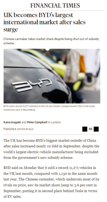 2025年9月,比亚迪在英国市场销量达11271辆,单一市场月销破万,同比激增880%,环比增长541%,在欧洲实现这一突破。前9个月其在英累计销量35604辆,同比增长576.9%,超越特斯拉、Mini等品牌。