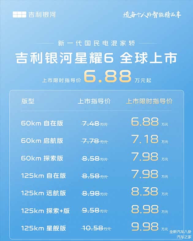 每次路过加油站看到油价牌就心疼?开电车又总担心电池安全、长途续航?10月30日正式上市的吉利 银河星耀6,用6.88万起的限时指导价,把超低油耗和硬核安全这两个家用车核心需求焊死在配置表上,让8万级插混市场多了个 省心之选。