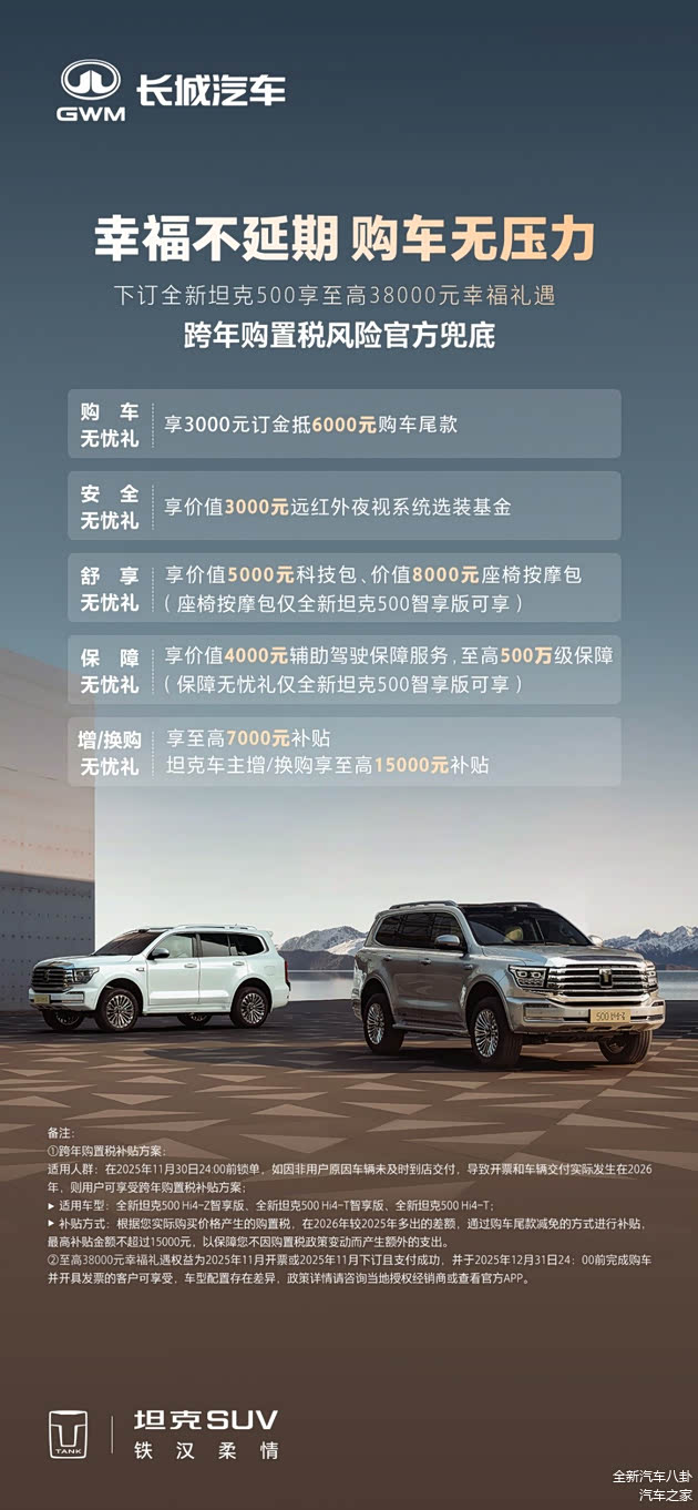 幸福不延期 购车无压力。目前下订全新坦克500尊享至高38000元幸福礼遇,跨年购置税风险官方兜底,“购车、安全、舒享、保障、增/换购”五大无忧豪礼等您来,快快行动起来吧!
