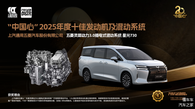 【2025年11月3日】今日,上汽通用五菱正式宣布, 星光730首搭灵犀动力系统斩获“2025中国心十佳动力系统”与“中汽中心高品质混动认证”两项重量级奖项。这一成果的取得,不仅印证了五菱在混动技术上的突破实力,也再次证明了中国自主品牌的创新底气。