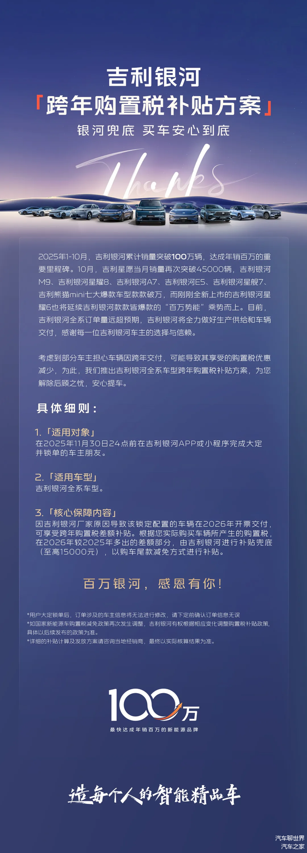 据悉,考虑到部分车主担心车辆因跨年交付,可能导致其享受的购置税优惠减少,目前吉利银河推出了全新的购车新政策,只要在2025年11月30日24点前在吉利银河APP或小程序完成大定并锁单的车主朋友,可享受跨年购置税差额补贴兜底!