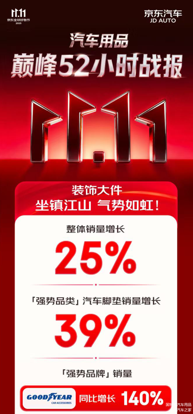各位车友,京东汽车11.11“巅峰52小时”战报刚刚出炉,其中一项数据格外引人注目:强势品牌固特异销量同比激增140%,并稳居“热销爆品”TOP1宝座!