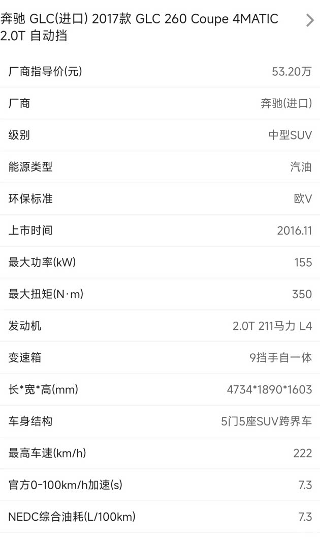 与国产的奔驰GLC不同,GLC Coupe全系都采用进口形式。相比国产GLC,它时尚优雅的轿跑外观吸引了不少人的注意,但49.60-63.80万的价格也是要比奔驰GLC贵不少的,