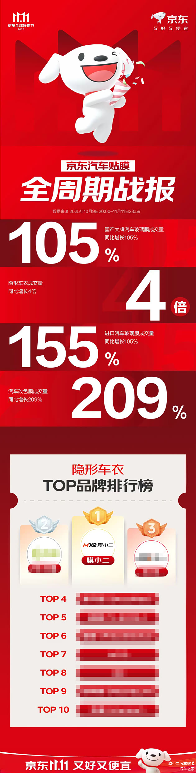 2025年双十一圆满收官,国产车衣领军品牌膜小二再次以实力印证行业地位,交出了一份亮眼的成绩单:膜小二不论从商品维度、品牌维度还是店铺维度均荣膺京东平台车衣行业第一名。京东官方销售热卖榜单前10名中,膜小二有4个单品强势入围,霸榜前两名。