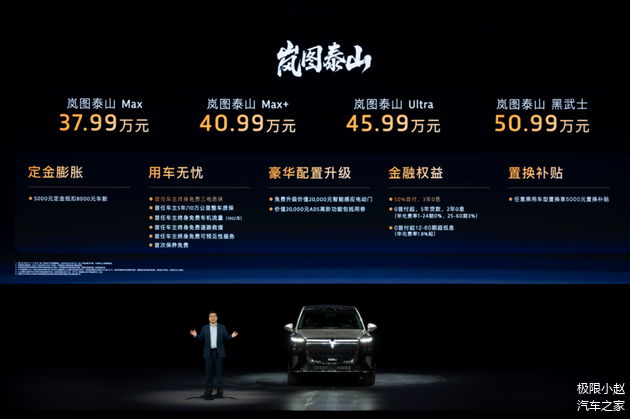 37.99万—50.99万元,是岚图泰山的官方指导价,同时,官方将诚意拉满,为用户带来了价值48000元的上市首销期限时权益,以及包括专属交付礼遇、积分增值回馈、购置税无忧保障在内的尊享计划。