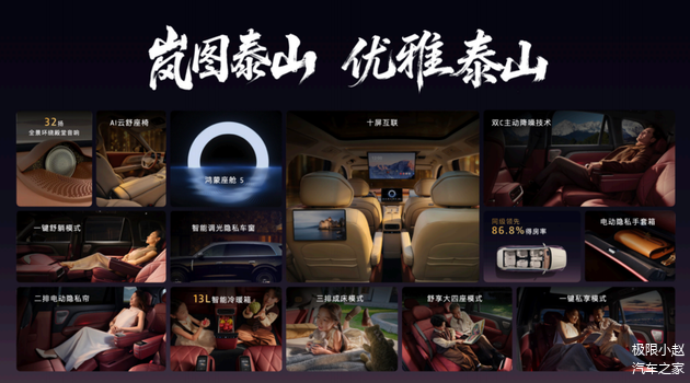 需要强调的是,岚图泰山在空间、座椅、音响等方面为用户带来不同寻常的舒适体验。其中,大六座空间,让每一席座椅都拥有足够宽敞且舒适的乘坐感受;搭载66颗高精度传感器的自适应区域AI座椅,可以实时感受乘客坐姿,并通过26点大师级气动按摩,帮助用户全身放松;VOYAH Sound音响通过32个扬声器、2300W殿堂级澎湃功率、9.1.5.8声道的科学布局,让车内每一位用户都仿佛置身于剧院。