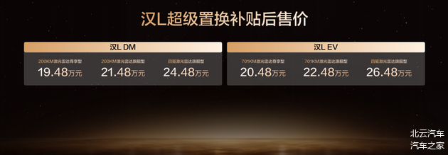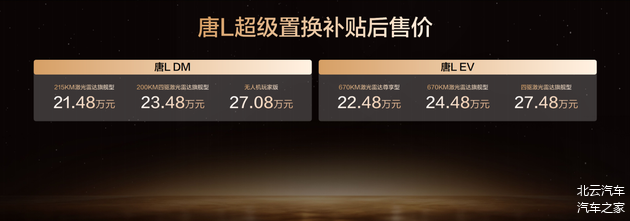 此次,汉L EV 3款车型,超级置换补贴后售价20.48万~26.48万元;汉L DM3款车型,超级置换补贴后售价19.48万~24.48万元;唐L EV 3款车型,超级置换补贴后售价22.48万~27.48万元;唐L DM3款车型,超级置换补贴后售价21.48万~27.08万元。同时,比亚迪还为用户准备了包含置换补贴在内的至高价值5.2万元(汉L)/4.5万元(唐L)尊享礼遇。(以上权益截至12月31日)