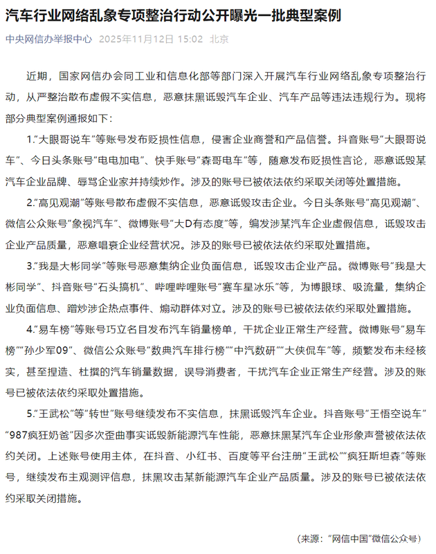 比亚迪品牌及公关处总经理李云飞转发公告时表示,公司能够理解因信息不足导致的误解,但对于持续发布失实内容、以攻击为目的的行为,将依法维权。今年早些时候,中央网信办在汽车行业网络乱象整治行动中已点名“王悟空说车”等账号,指出其多次歪曲新能源汽车性能并损害车企声誉,相关账号随后被依法依约关闭。