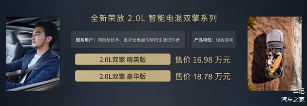 2.0L 智能电混双擎系列服务于拥抱新技术、追求全维最优解的生活进阶者,希望在性能与经济性、品质与科技感之间找到完美的平衡点;全新荣放2.0L双擎精英版与豪华版,让先进技术成为他们触手可及、全面提升生活品质的温暖伙伴。全新荣放2.0L双擎精英版,售价为16.98万元;全新荣放2.0L双擎豪华版,售价为18.78万元。