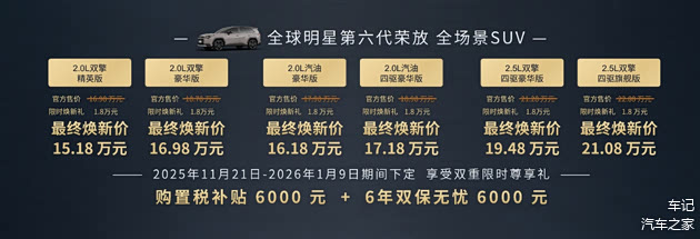 全新荣放在外观、智能座舱、动力、智驾辅助、安全配置等方面全面升级,全系商品力提升达到1.5万元水平,增配价更低,诚意满满。不仅如此,为回馈广大用户的支持,11月21日起到2026年1月9日期间,确定为“限时尊享下定期”。期间预订用户,将享有高达1.8万元的现金直给,以及购置税补贴6000元,价值6000元售后服务权益的双重限时大礼包。
