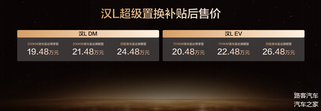 此次,汉LEV共带来3款车型,补贴后售价20.48万~26.48万元;汉L DM3款车型,补贴后售价19.48万~24.48万元;同时,比亚迪还为用户准备了包含置换补贴在内的至高价值5.2万元尊享礼遇。(以上权益截至12月31日)