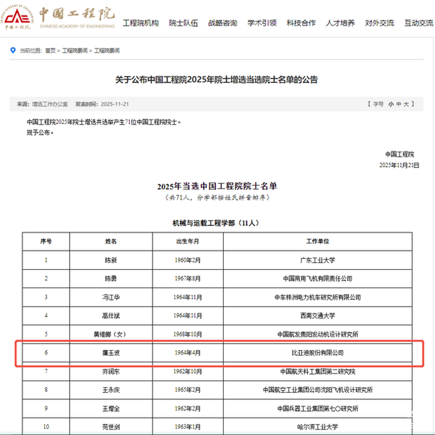 2025年11月21日,中国工程院公布了2025年院士增选结果。比亚迪集团首席科学家、汽车总工程师、汽车工程研究院院长廉玉波当选中国工程院院士。